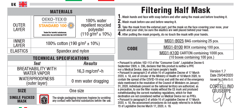 The mask is equipped with elastics around the head, providing a good adherence to the face. The mask is neither a PPE, nor a medical device but it is intended for people that have to respect all instructions about safe distance and all necessary precautionary rules imposed by COVID-19 emergency.