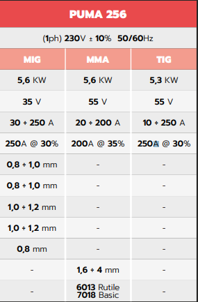 Additionally, the Puma 256 MIG inverter welder has built-in safety features, including thermal overload protection and voltage fluctuations protection, ensuring the longevity and reliability of the machine.